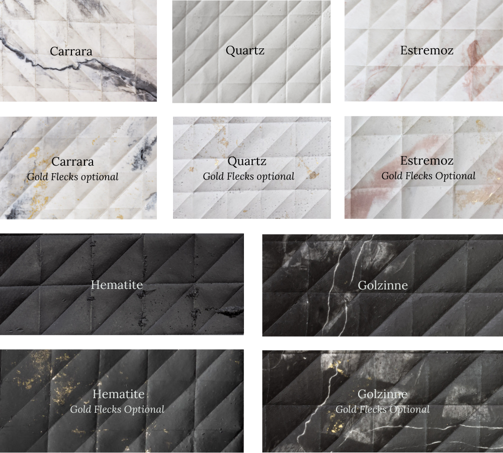 Constructed of MU's own Soft Stone, a special composite of natural silica and oxygen with flecks of gold leaf integrated into the material. Handmade ceramic socket cover. Fabric covered wire in white. Metal canopy in white.