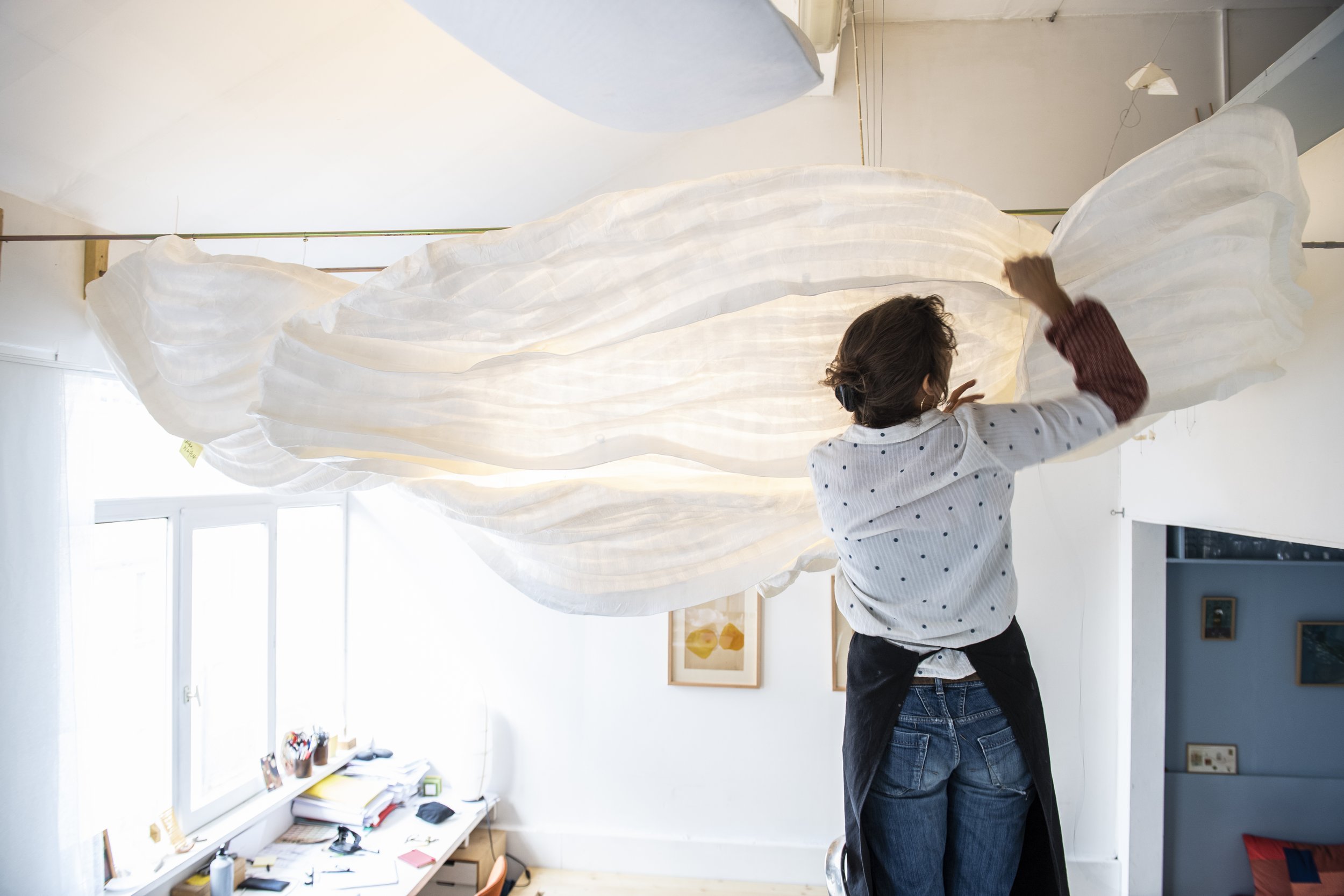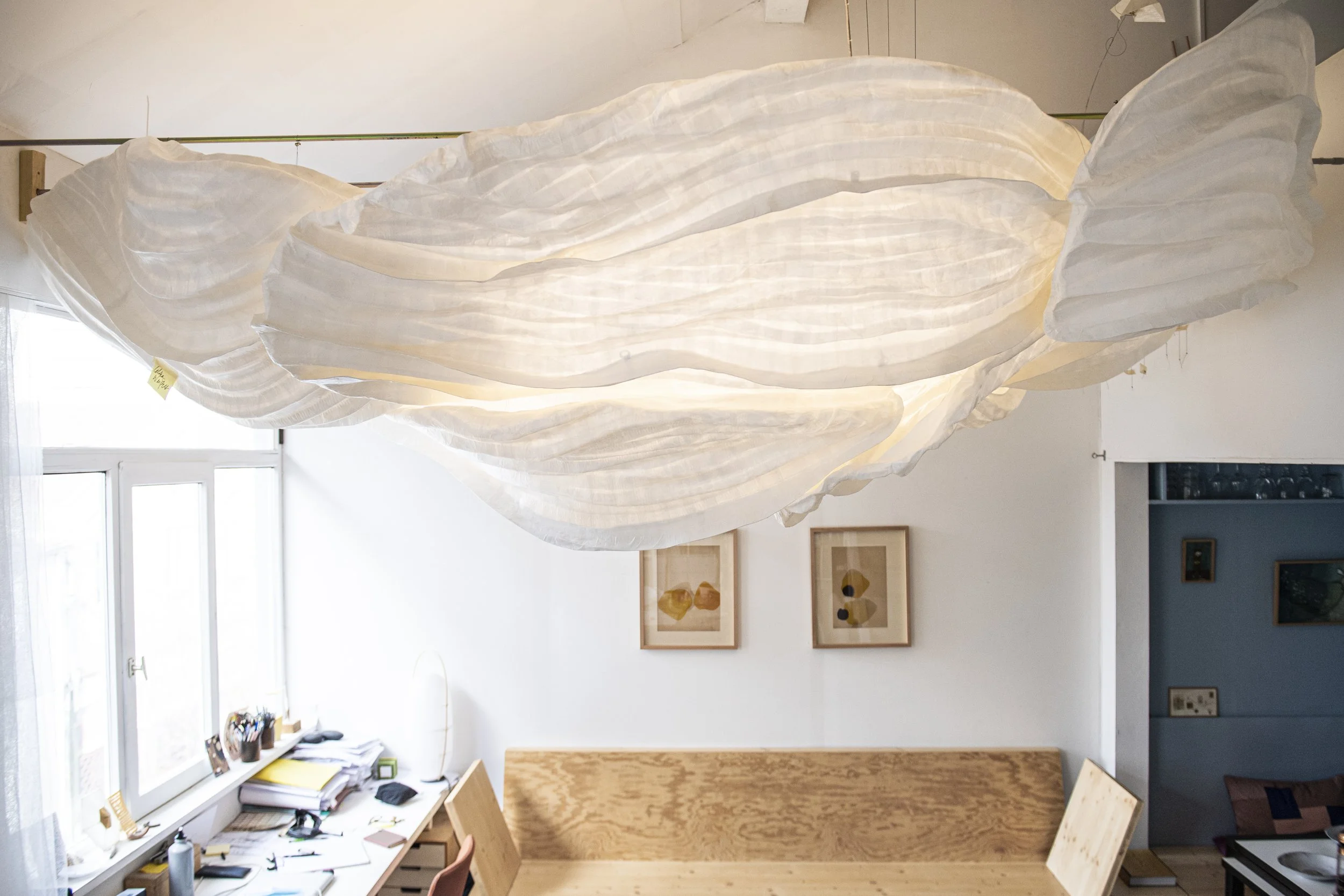The extraordinary scale of this bespoke piece is made possible by the unique nature of washi paper: exceptionally light, yet remarkably strong. This rare balance allows Céline Wright to conceive large, airy volumes that appear to defy gravity.