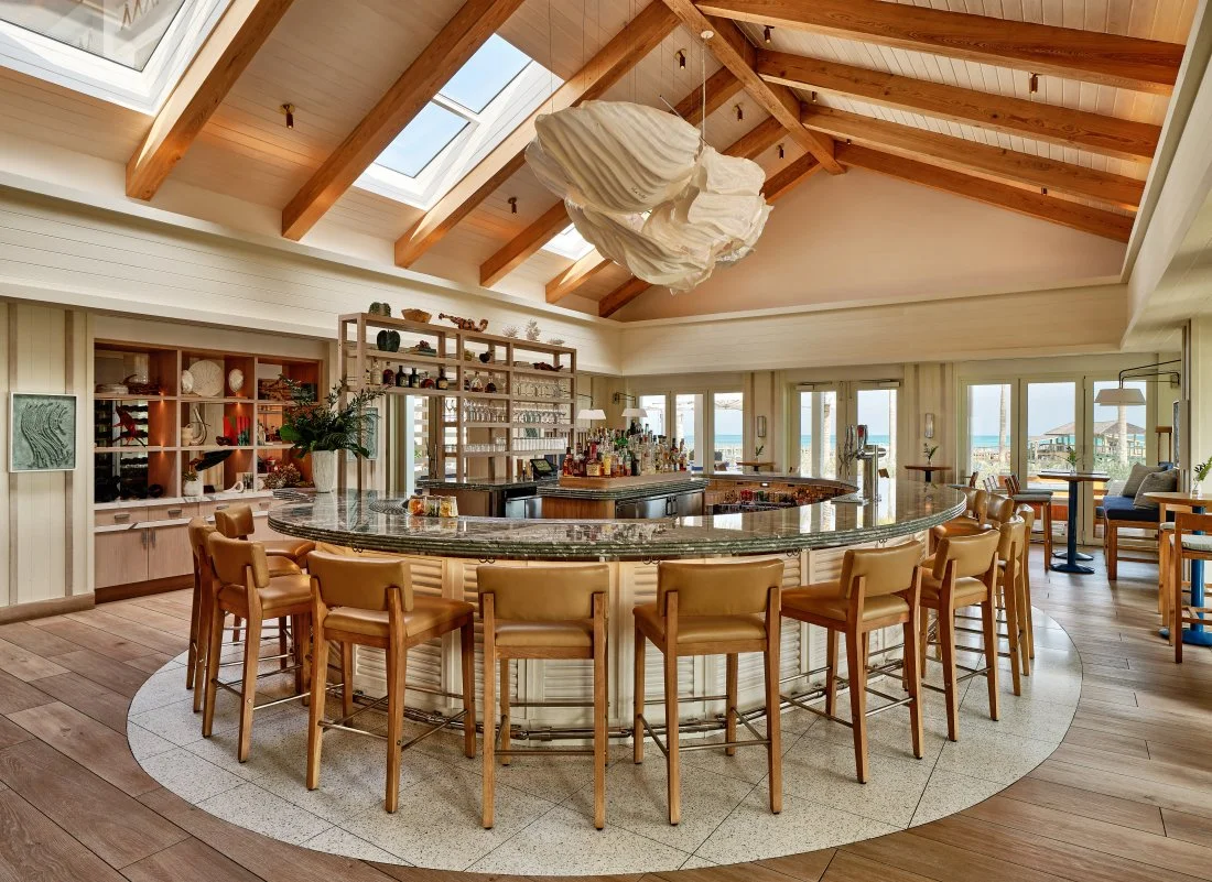 In this luminous bar room designed by Meyer Davis, a floating, monumental composition by Céline Wright unfolds in quiet motion. Crafted entirely from washi paper, the custom light fixture drifts like a suspended seascape — its form inspired by shells, tides, and the surrounding Bahamian horizon.