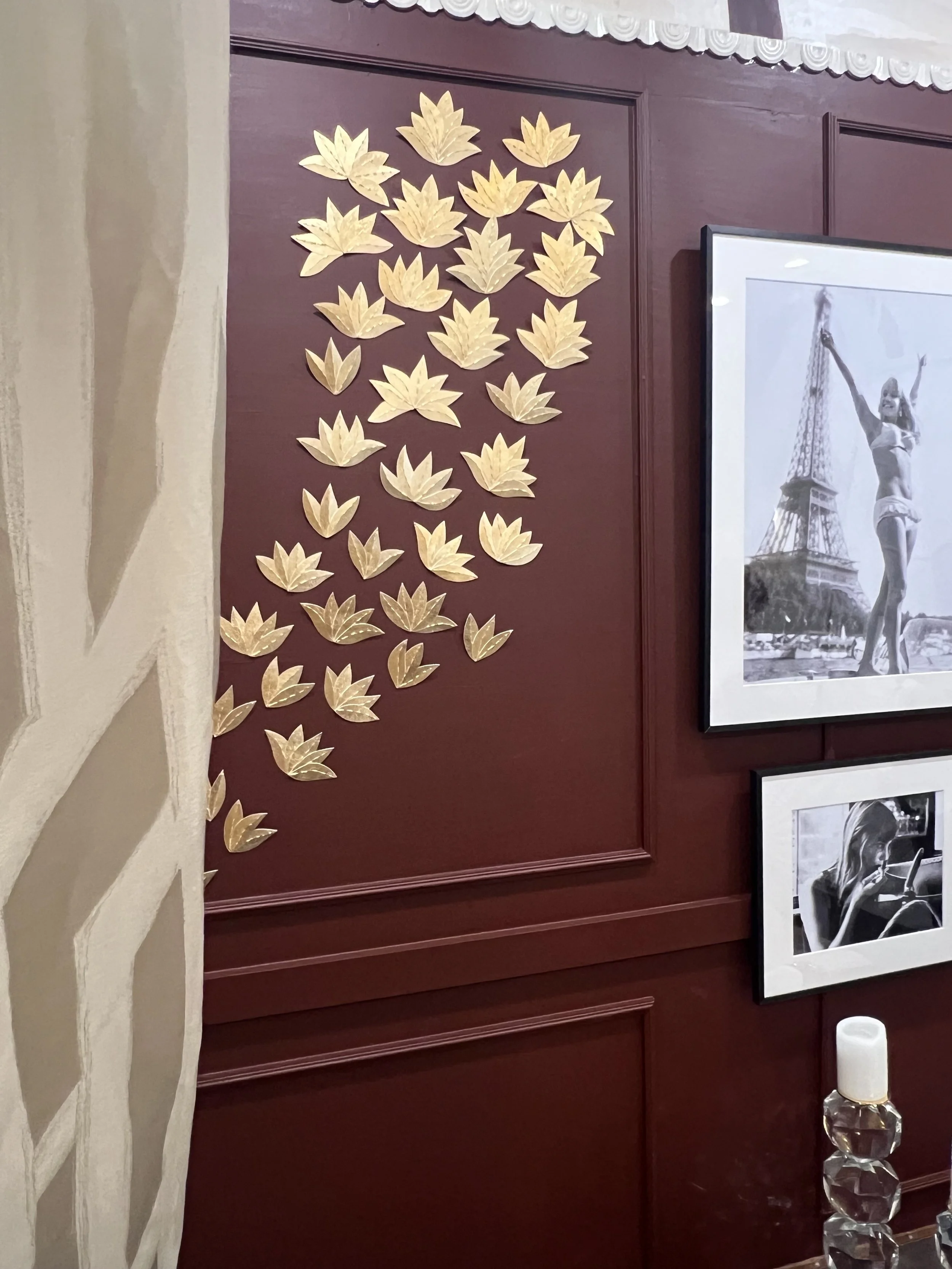For Laure Nell Interiors design project, Lucie Touré drew inspiration from the intricate beauty of the Cartier silk twill, a piece rich in floral motifs. What Lucie loves most is immersing herself in a designer’s vision, allowing it to spark a truly unique artistic interpretation. Here, the floral patterns of the scarf became the foundation for her gilded and embroidered paper flowers—a haute couture embellishment that infuses the space with both delicacy and preciousness.