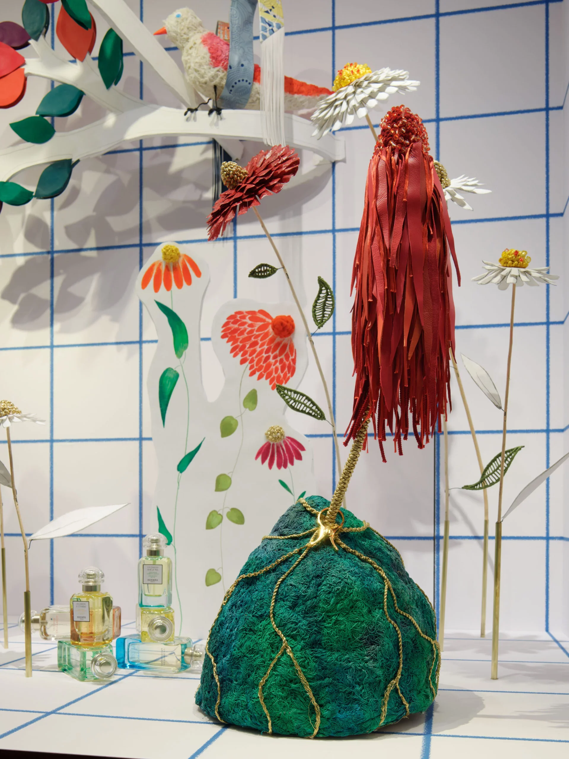 These windows display invite us to revisit our early memories—brought to life little by little through imagination, transforming dreamed objects into tangible ones. Here, flowers, fruits, and insects animate the two scenes presented in the windows.