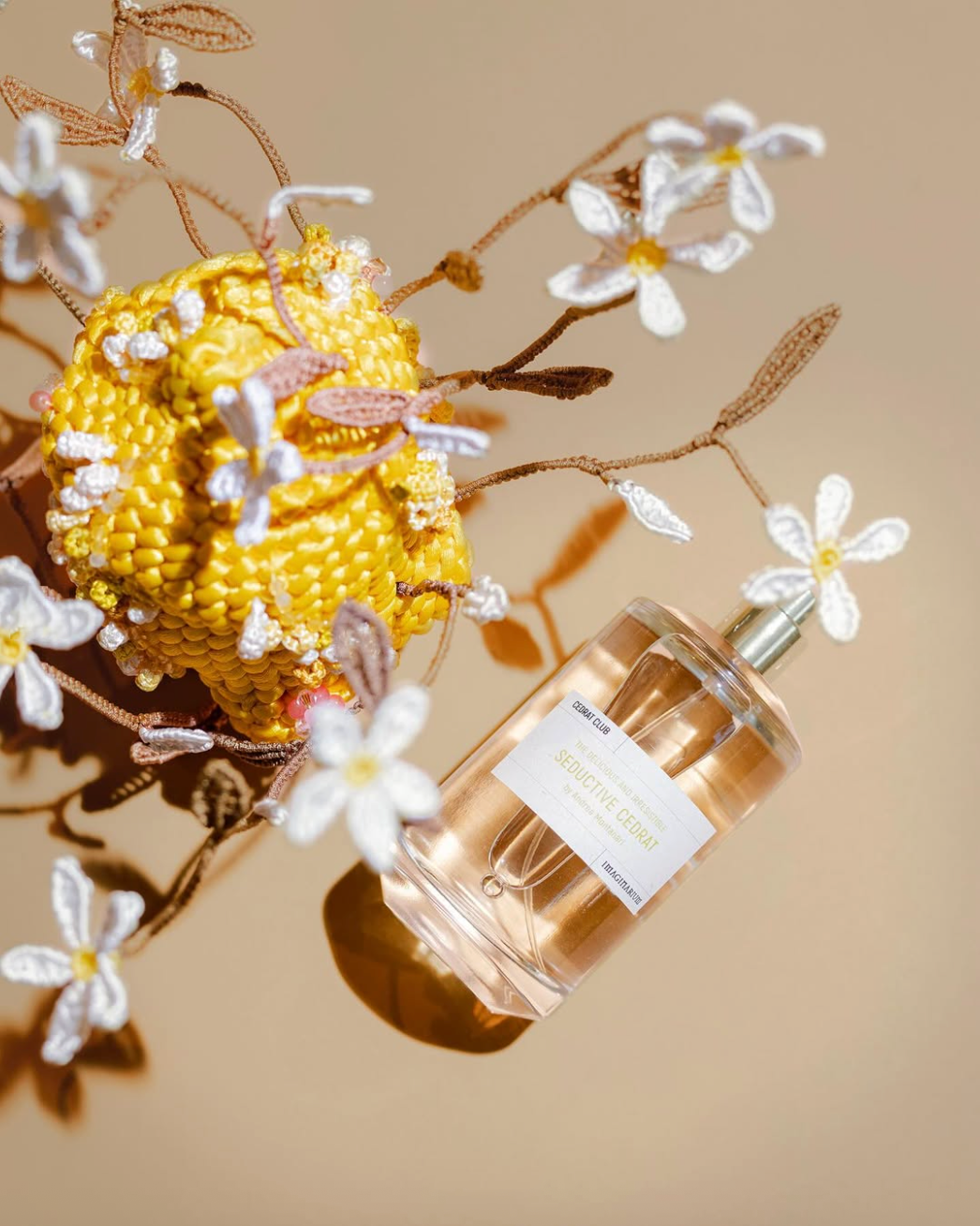 Each fragrance was interpreted through vibrant, living forms—hybrid fruits composed of embroidered flowers and pearls. These neo-citrus creations blurred the boundaries between art and perfume, recalling both the Garden of the Hesperides and a fantastical garden of delights.