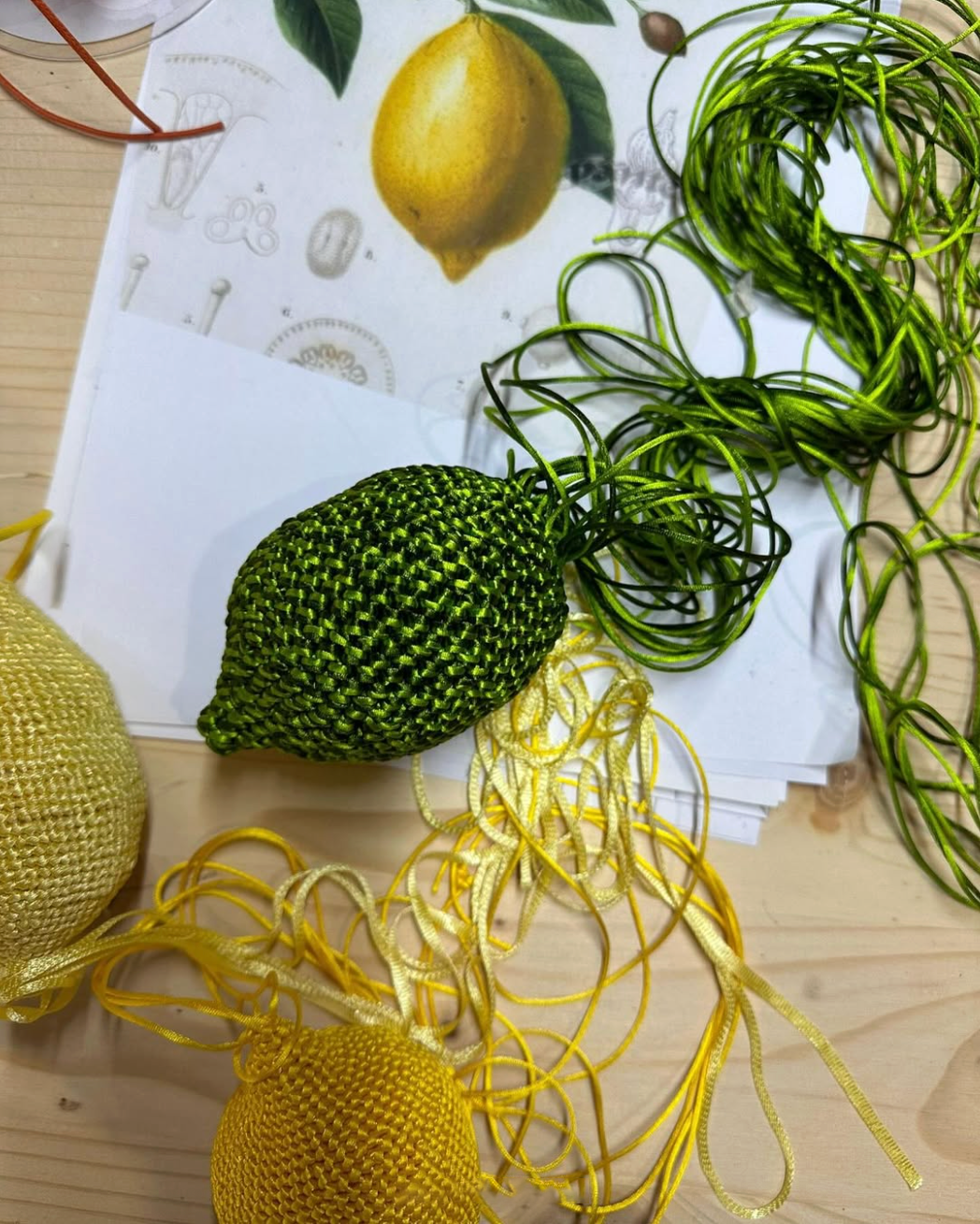 Facing the garden at the gallery’s entrance stood an inverted lemon tree, rising nearly 98 inches high (2.5 m), created jointly by Laurentine Périlhou’s atelier and basket maker Audrey Bruneau. Beneath it, nine dreamlike pieces evoked imaginary citrus fruits, echoing the theme of the collection.