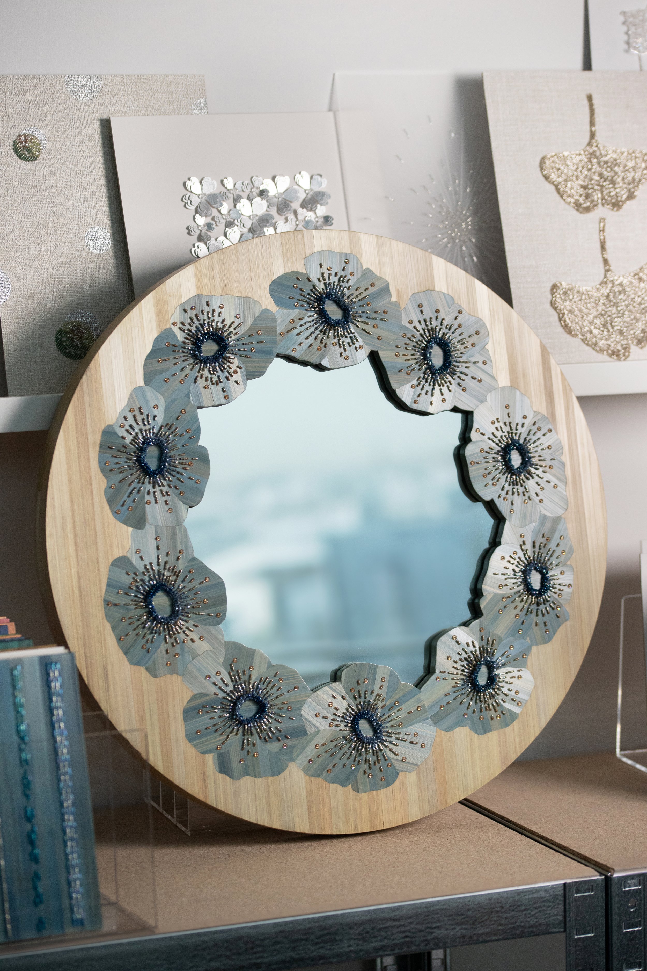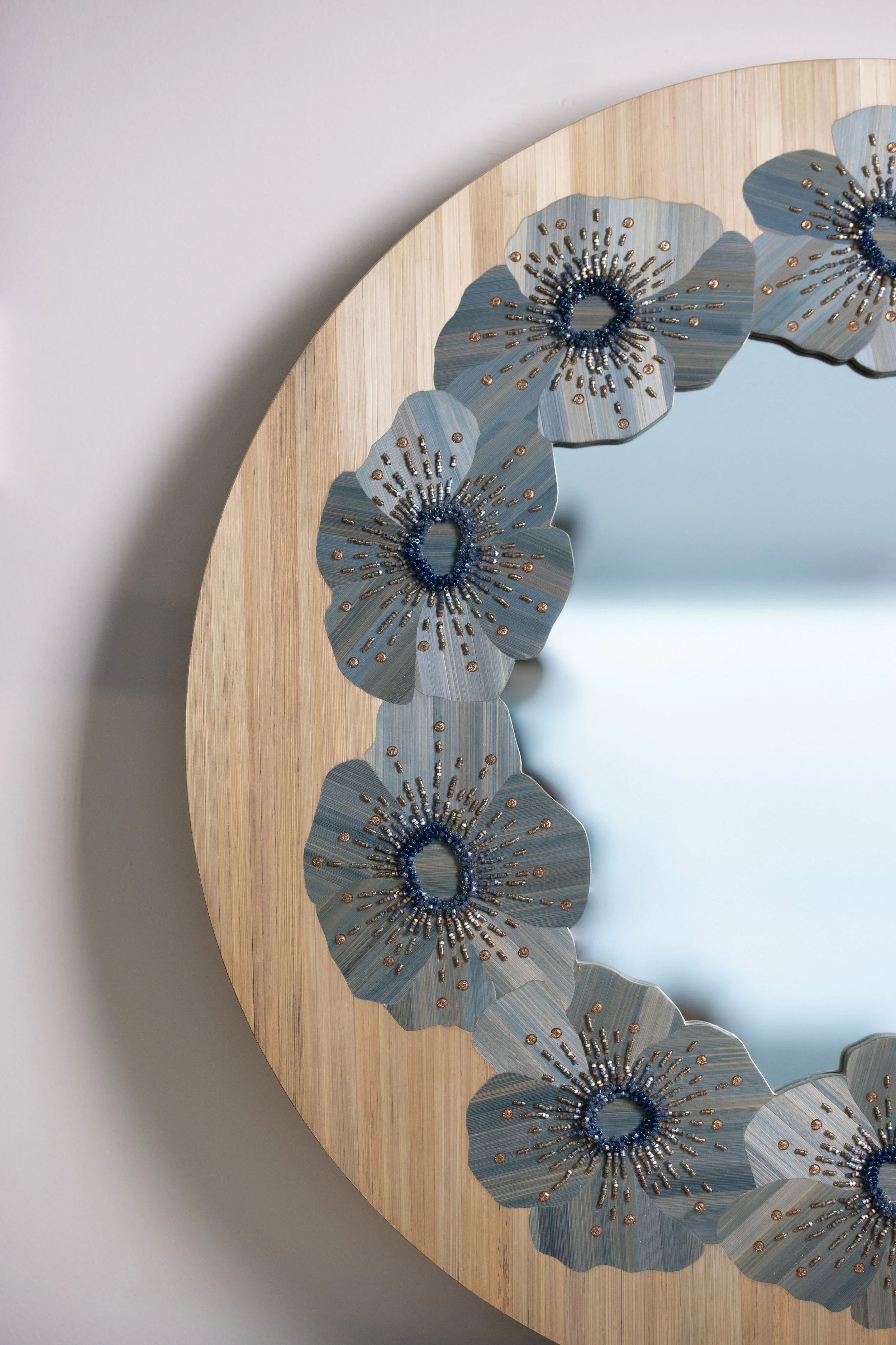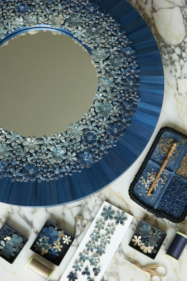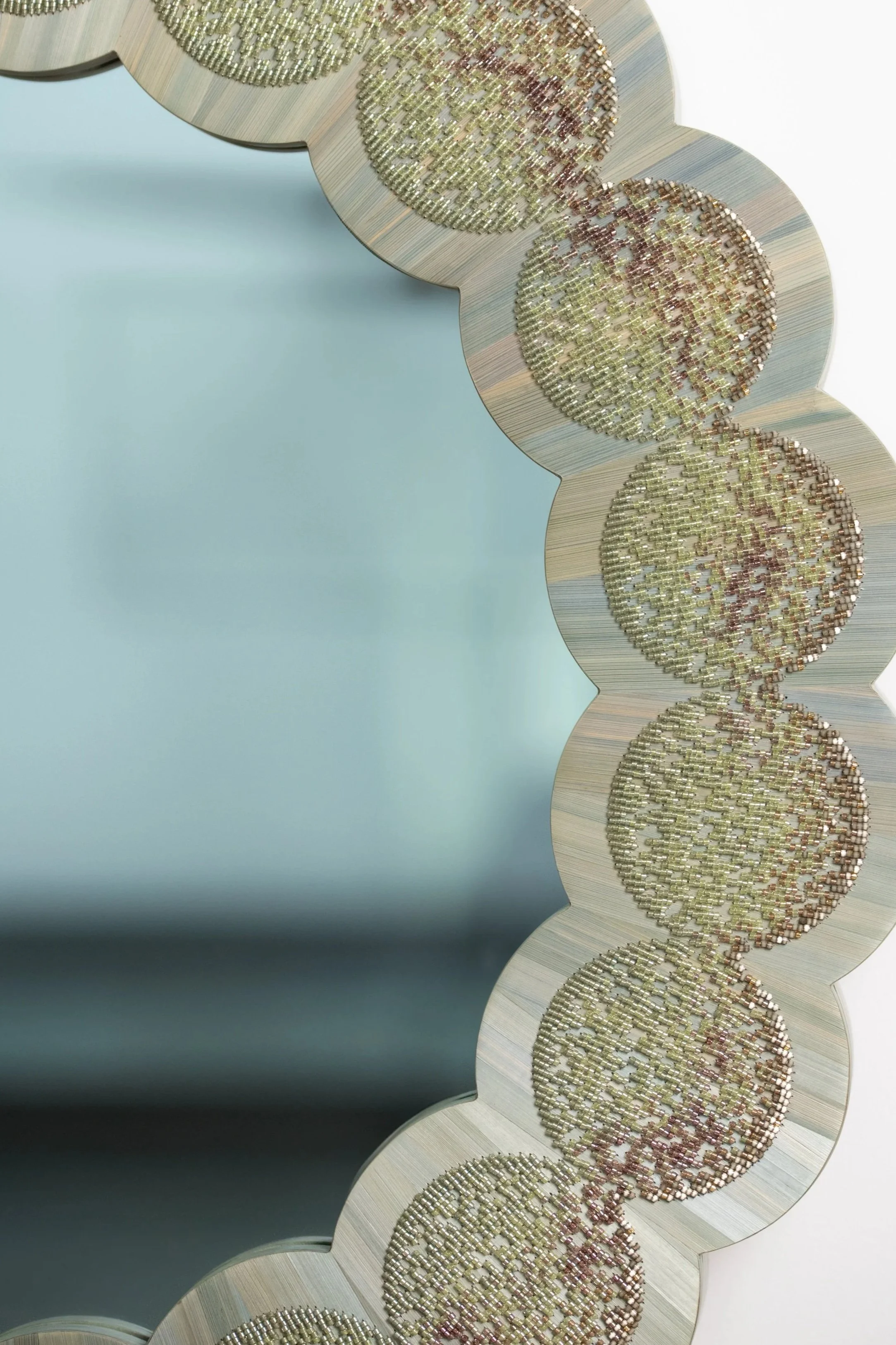 Born from the dialogue between Lucie Touré and the Ateliers Lison de Caunes, this collection of embroidered straw marquetry mirrors celebrates the meeting of two rare savoir-faire. On surfaces entirely composed of hand-cut straw marquetry—crafted by the Ateliers Lison de Caunes, renowned guardians of this ancestral technique—Lucie Touré brings her singular language through the embroidery of glass beads and floral motifs, delicately stitched by hand.