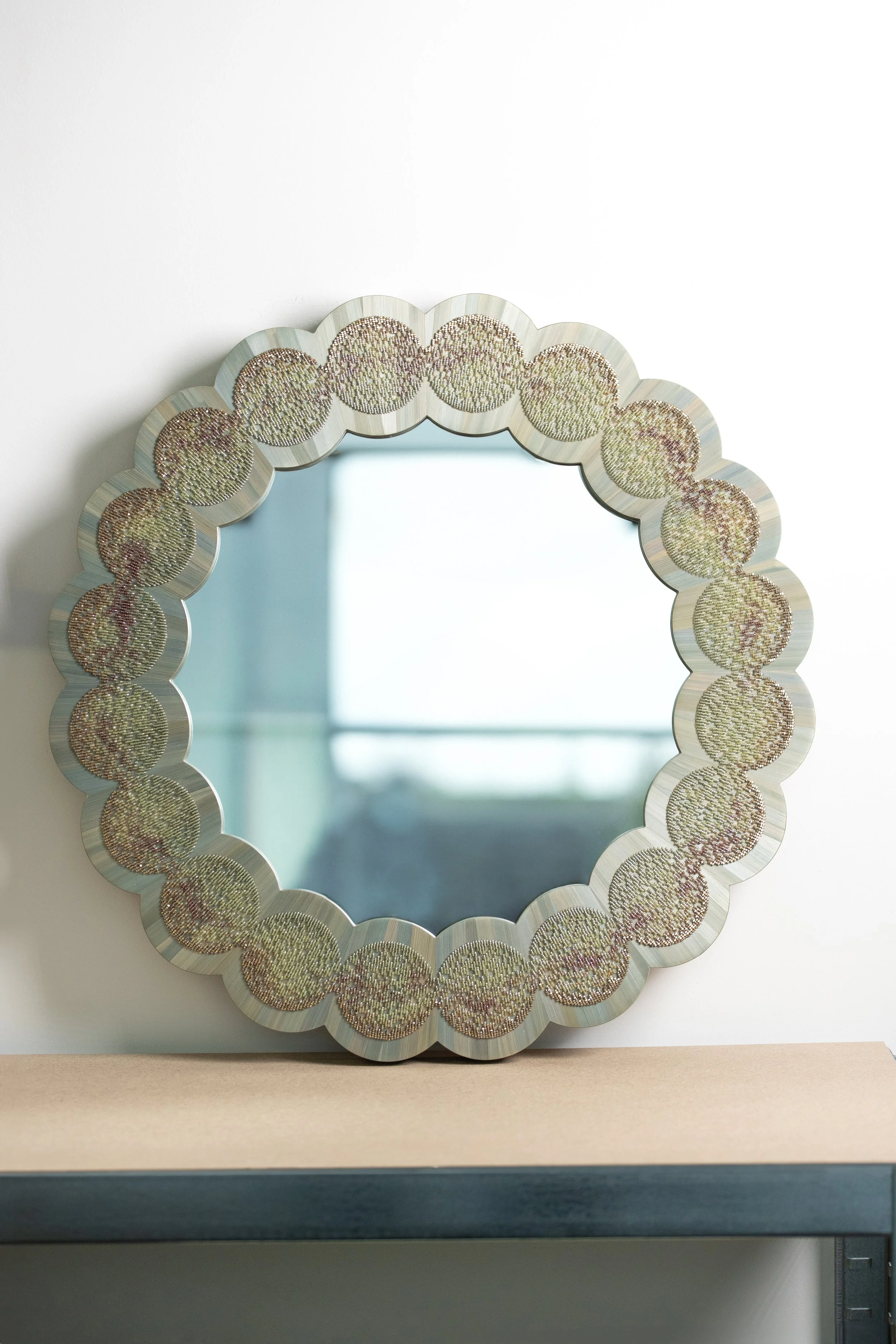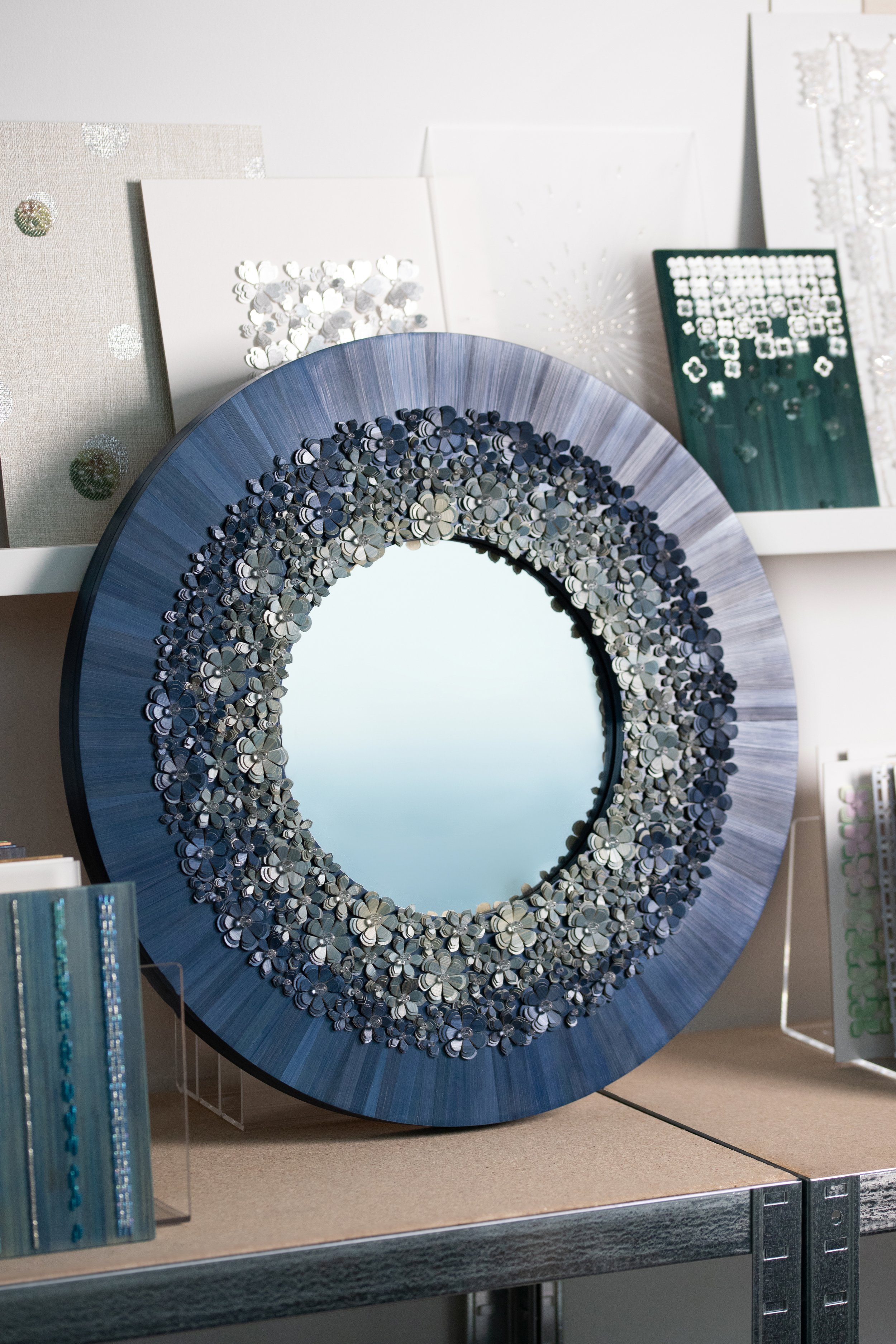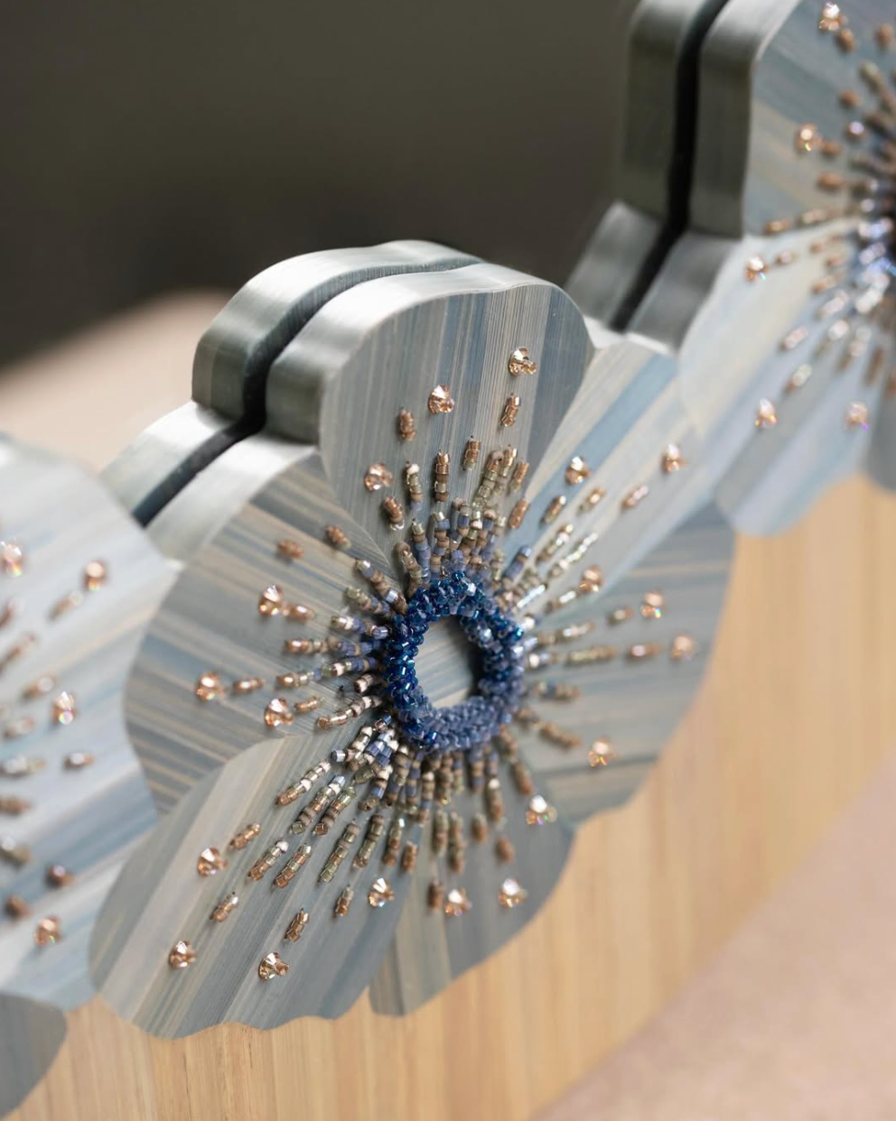 Born from the dialogue between Lucie Touré and the Ateliers Lison de Caunes, this collection of embroidered straw marquetry mirrors celebrates the meeting of two rare savoir-faire. On surfaces entirely composed of hand-cut straw marquetry—crafted by the Ateliers Lison de Caunes, renowned guardians of this ancestral technique—Lucie Touré brings her singular language through the embroidery of glass beads and floral motifs, delicately stitched by hand.