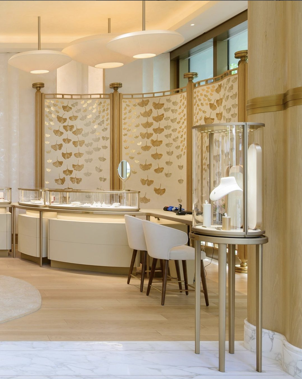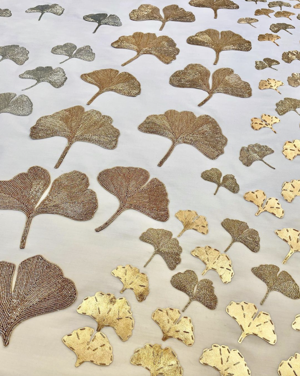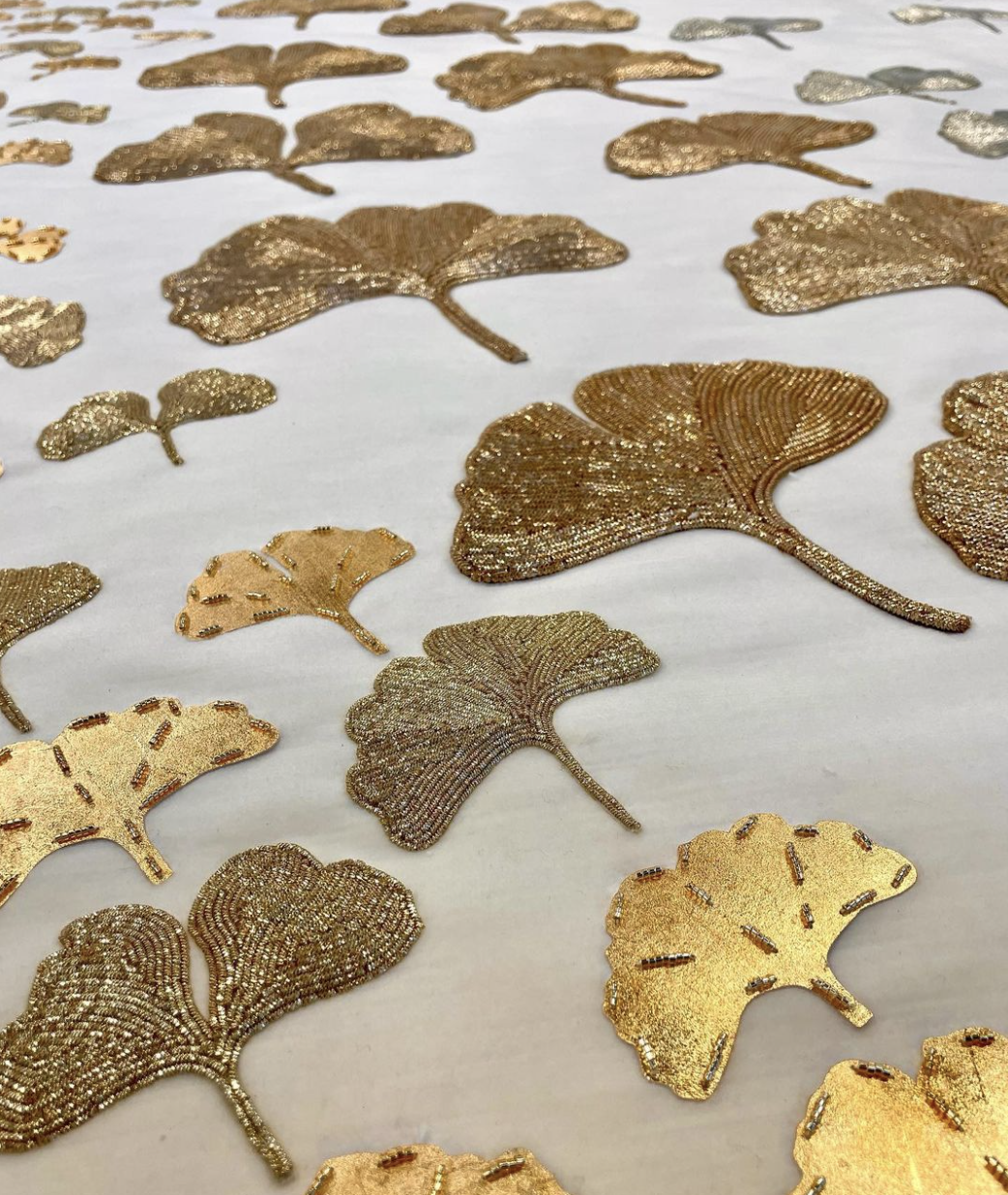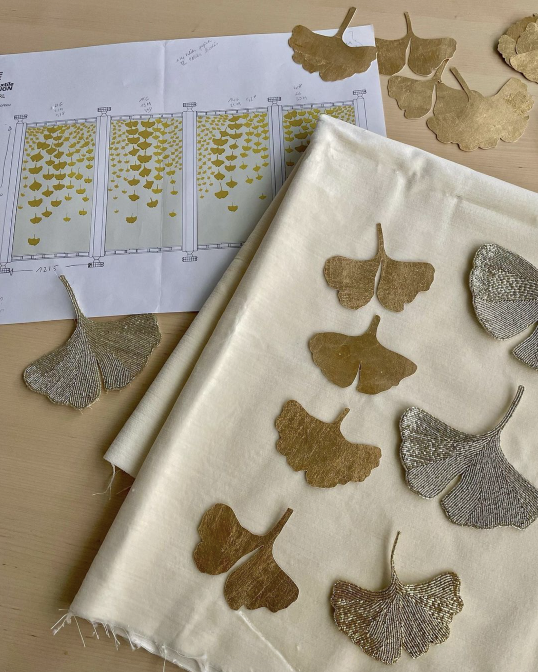 Lucie Toure created a hand-embroidered screen for the Cartier flagship boutique in Chengdu, China, designed by Laura Gonzalez Officiel. Inspired by the delicate form of ginkgo leaves, the composition brings together paper elements gilded with copper leaf and metallic embroidery applied onto velvet.