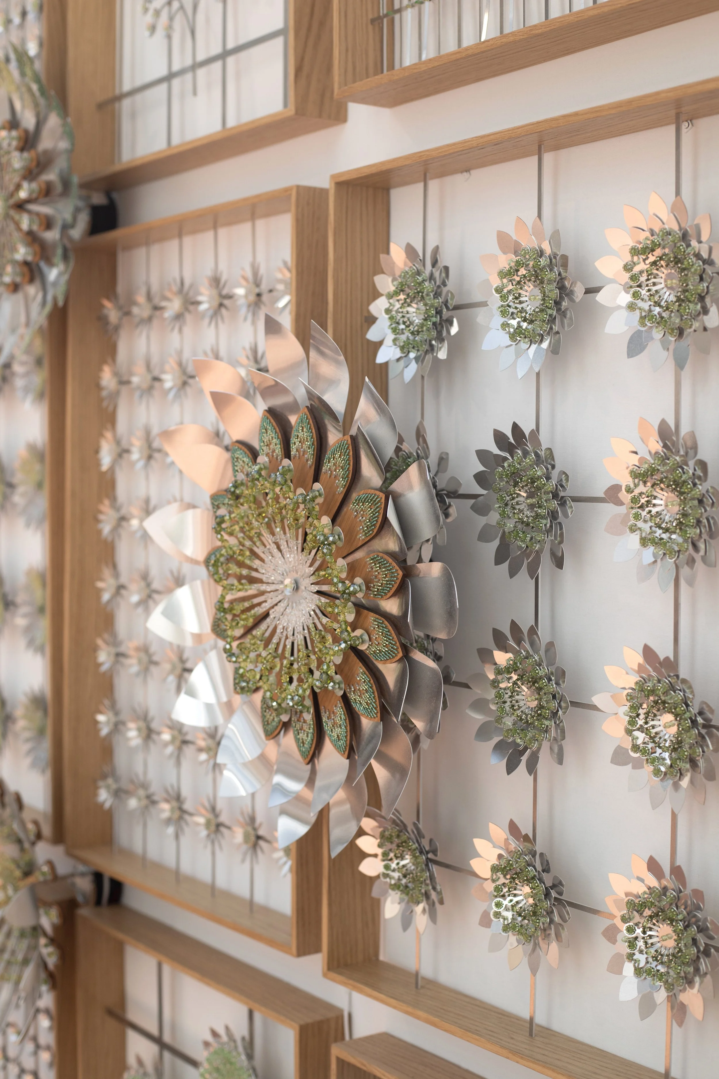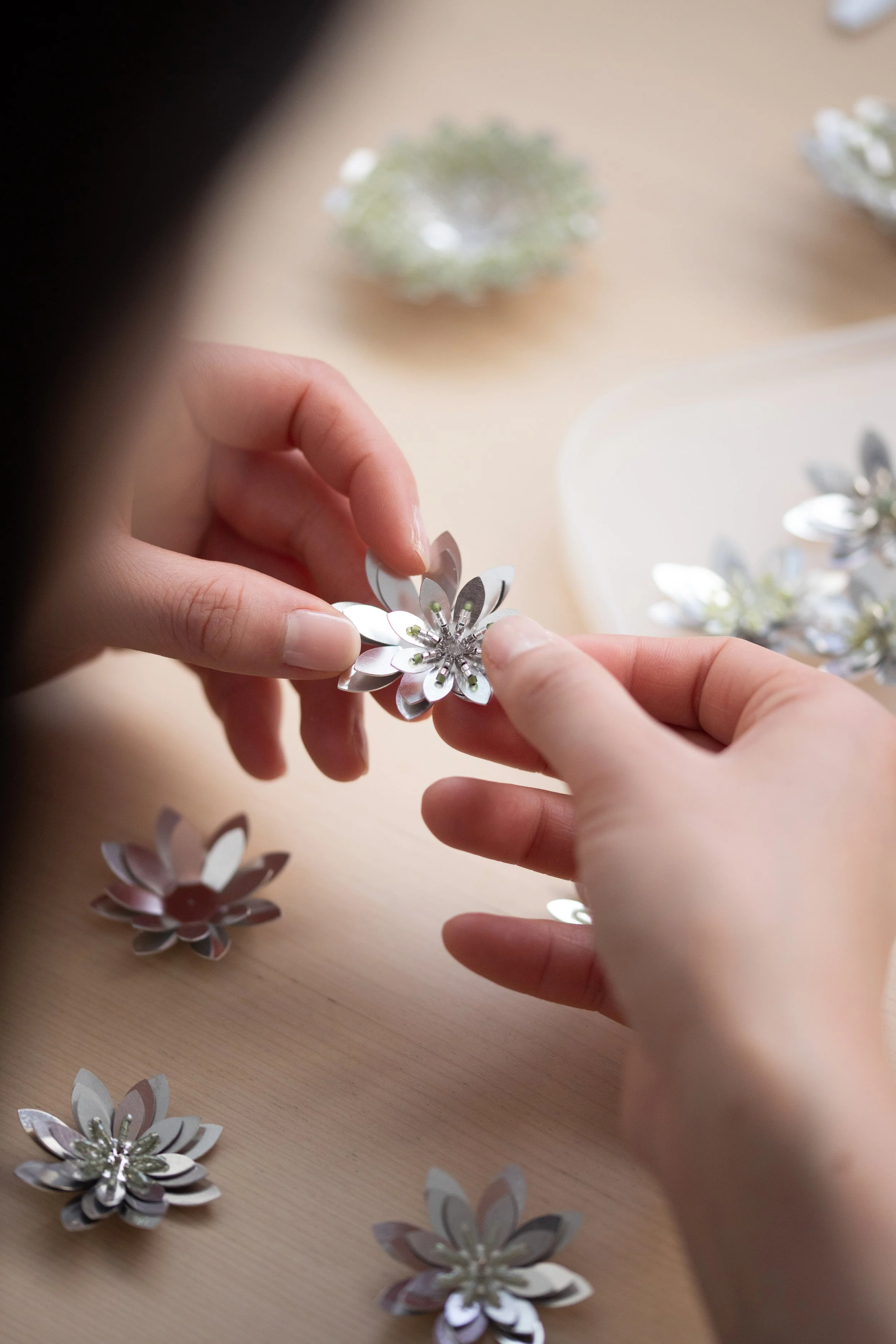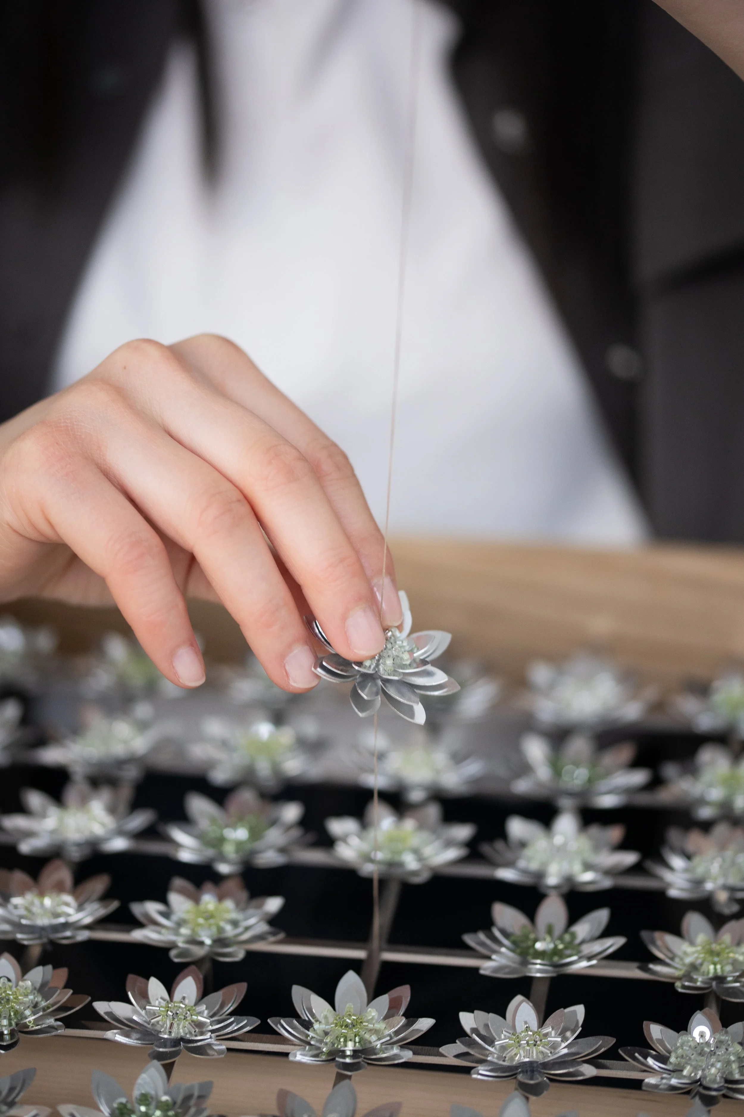 Inspired by nature yet shaped by technique, the piece reveals a landscape of hand-cut forms, layered textures, and meticulous embroidery with glass beads. Each petal is sculpted and stitched by hand, capturing light as it moves across the surface. The result is a living composition—one that shifts with perspective, inviting touch, contemplation, and time.