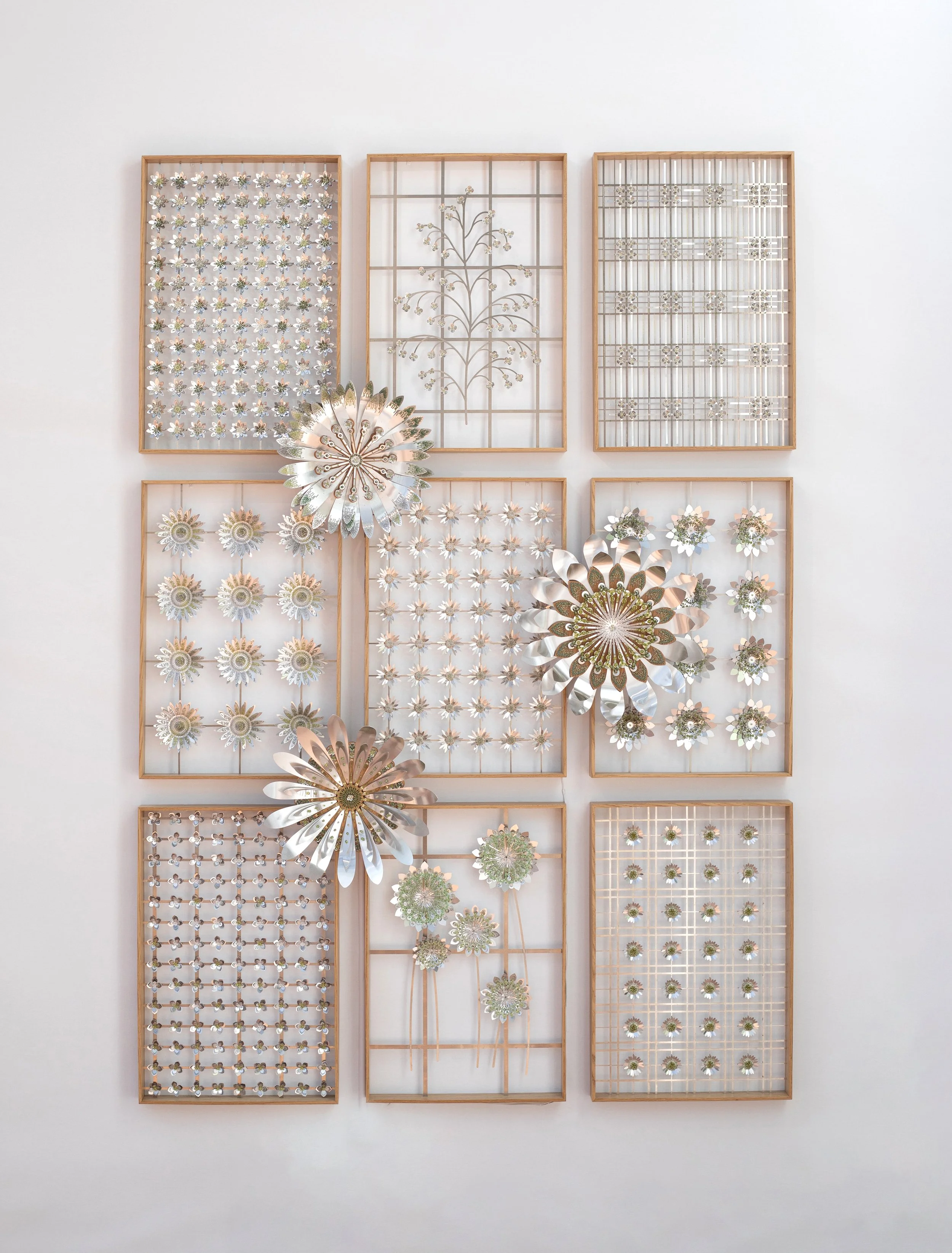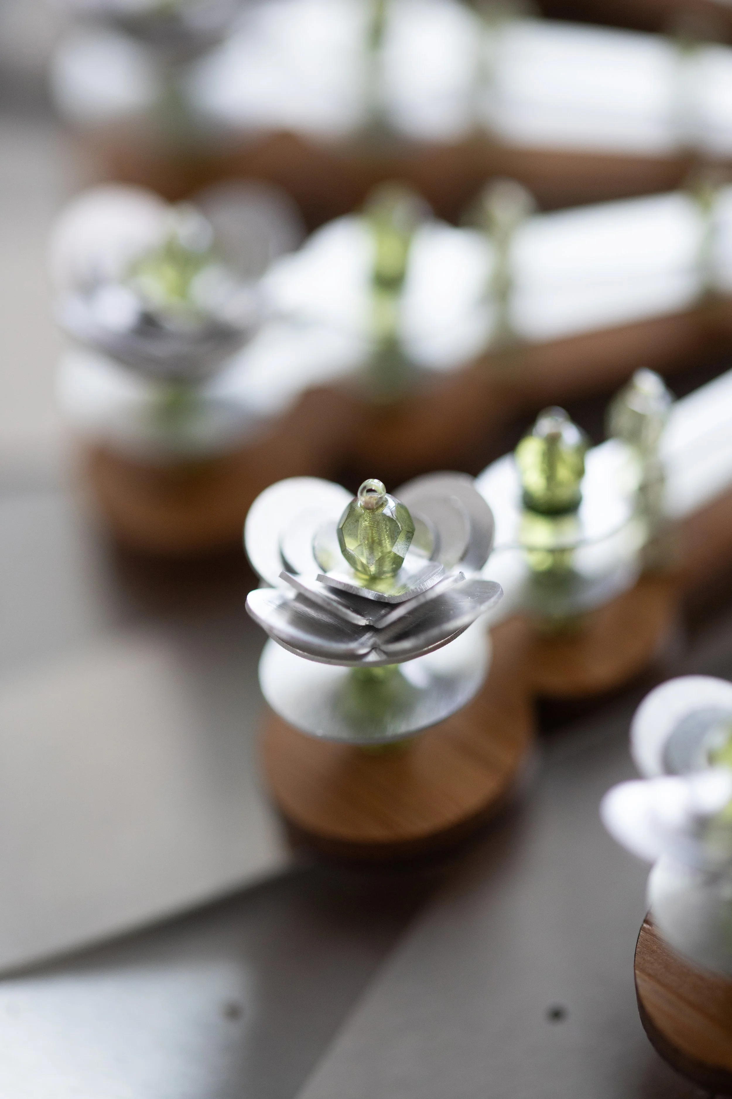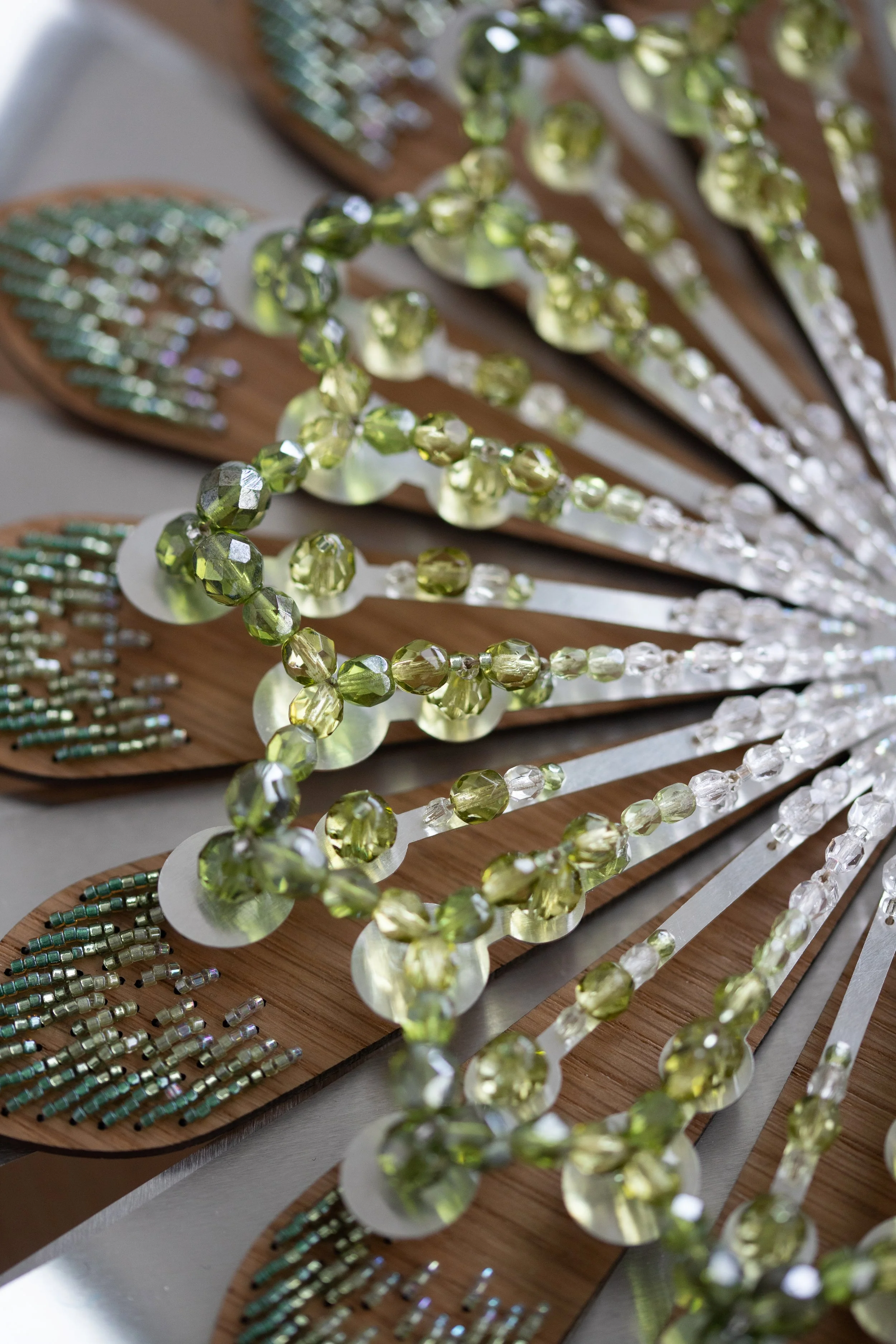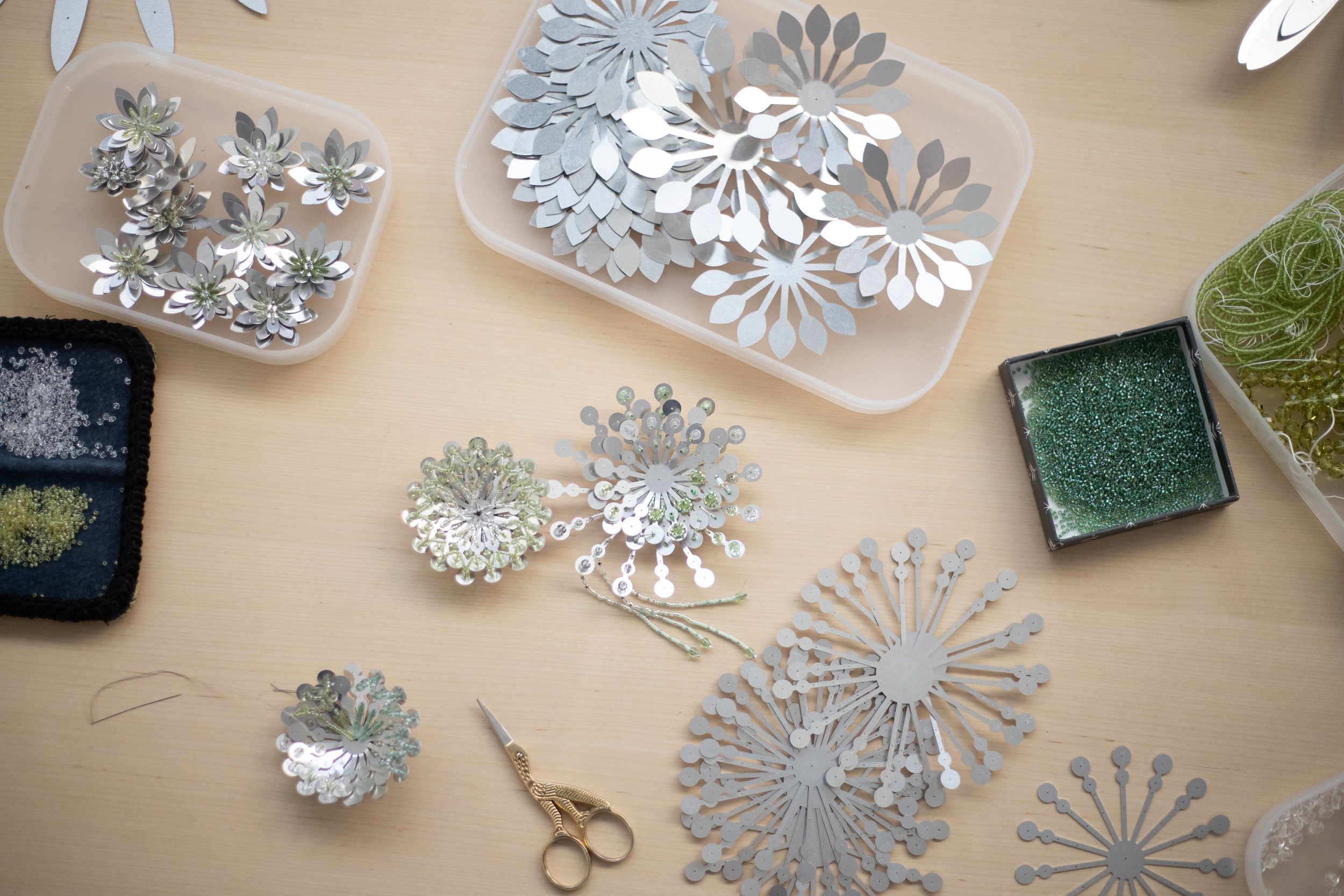 Inspired by nature yet shaped by technique, the piece reveals a landscape of hand-cut forms, layered textures, and meticulous embroidery with glass beads. Each petal is sculpted and stitched by hand, capturing light as it moves across the surface. The result is a living composition—one that shifts with perspective, inviting touch, contemplation, and time.