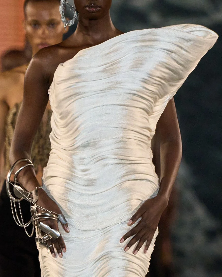 Every gesture of the weave reflects a deep understanding of tension, balance, and precision. The textile becomes both surface and structure, expressive and architectural, embodying a rare dialogue between artistic research and couture expression.