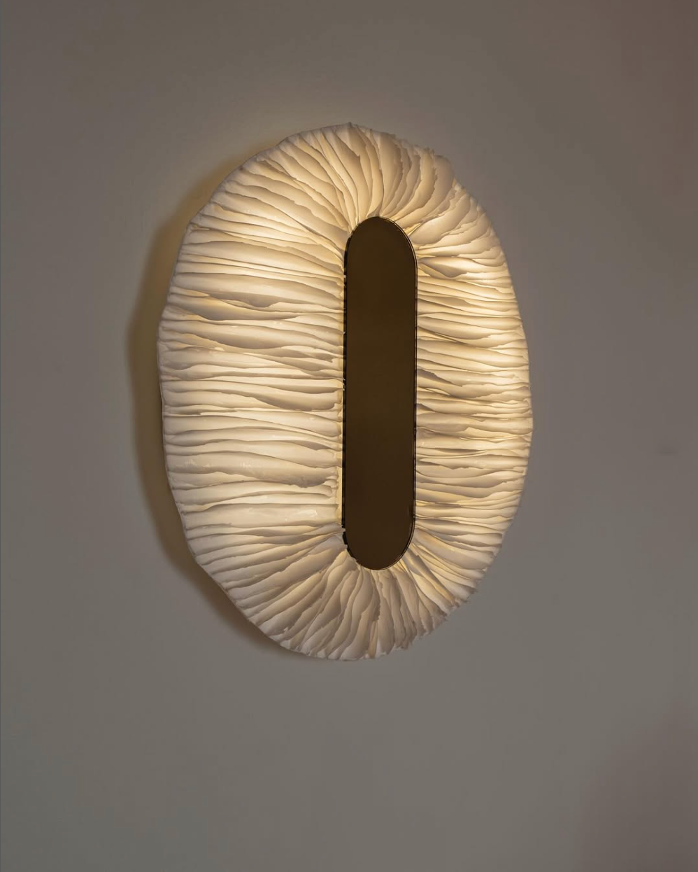 This bespoke luminous mirror is crafted from thin, layered sheets of soft stone, revealing a rare interplay of light, movement, and material. Designed as both a functional object and a sculptural centerpiece, the mirror brings a quiet sense of poetry to luxury interior spaces.